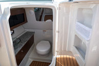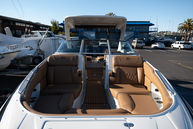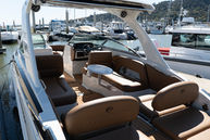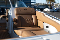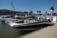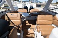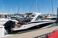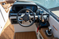 Other features include a three-bank battery charger, bow and cockpit canvas covers, snap-in carpet, pull-up cleats, a bow cooler, docking lights, fender storage at the bow, LED cockpit lighting, an aluminum hardtop with a pull-out aft shade, performance amplified stereo system, a swim platform F.A.S.T. Tab® Vented Hull Chine W/Reversed Chines & Delta Performance Pad, and Soft Touch mat, and underwater lights.